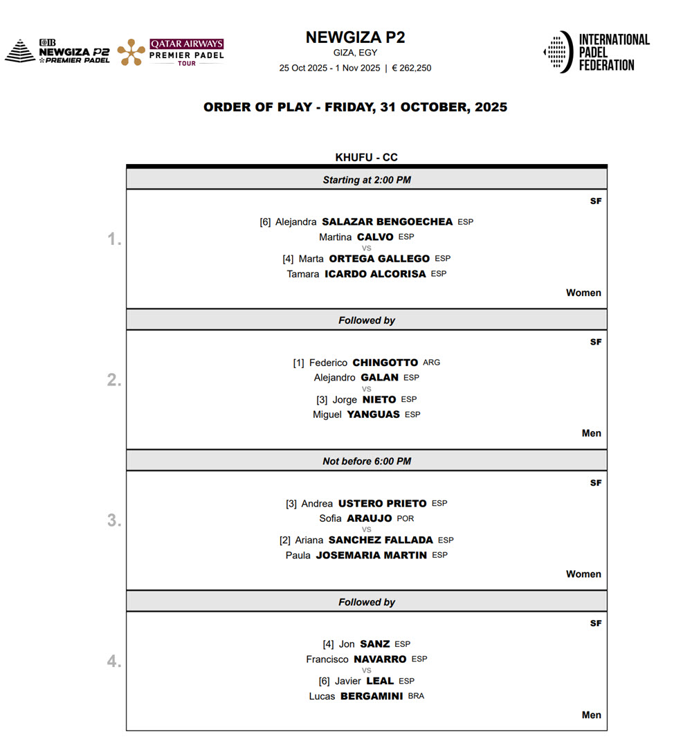 Padel fans are in for a treat as the Qatar Airways Premier Padel Tour NewGiza P2 reaches the semi-final stage on Friday, October 31, 2025, at the Khufu – Central Court in Giza, Egypt. The day is packed with top-tier action, featuring the best in both the Women’s and Men’s draws.